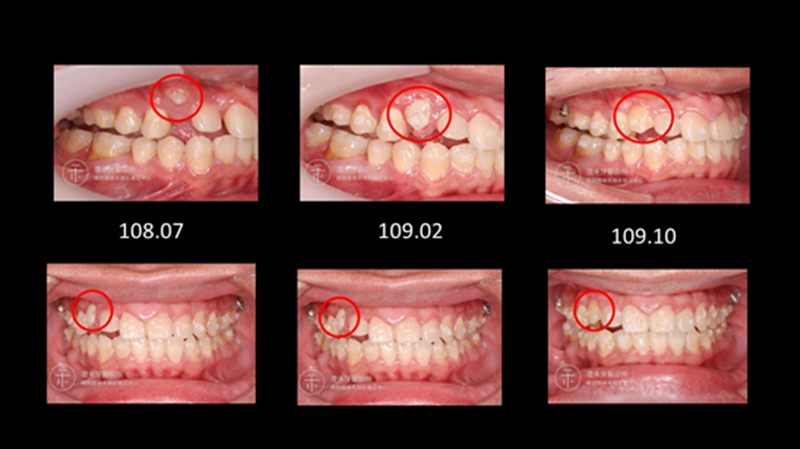前牙錯咬、犬齒生長位置受阻,將第一小臼齒拔除,使犬齒有空間長出